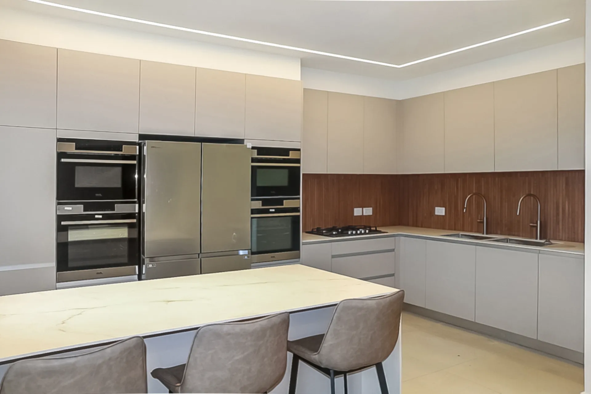 הדירה מעוצבה בסגנון מודרני נקי, המשלב חומרים טבעיים עם עיצוב מינימליסטי. המראה הכולל מציג את השימוש בצבעים בהירים, טקסטורות חלקות ומבנים גיאומטריים המאפשרים ליצור תחושת מרחב.