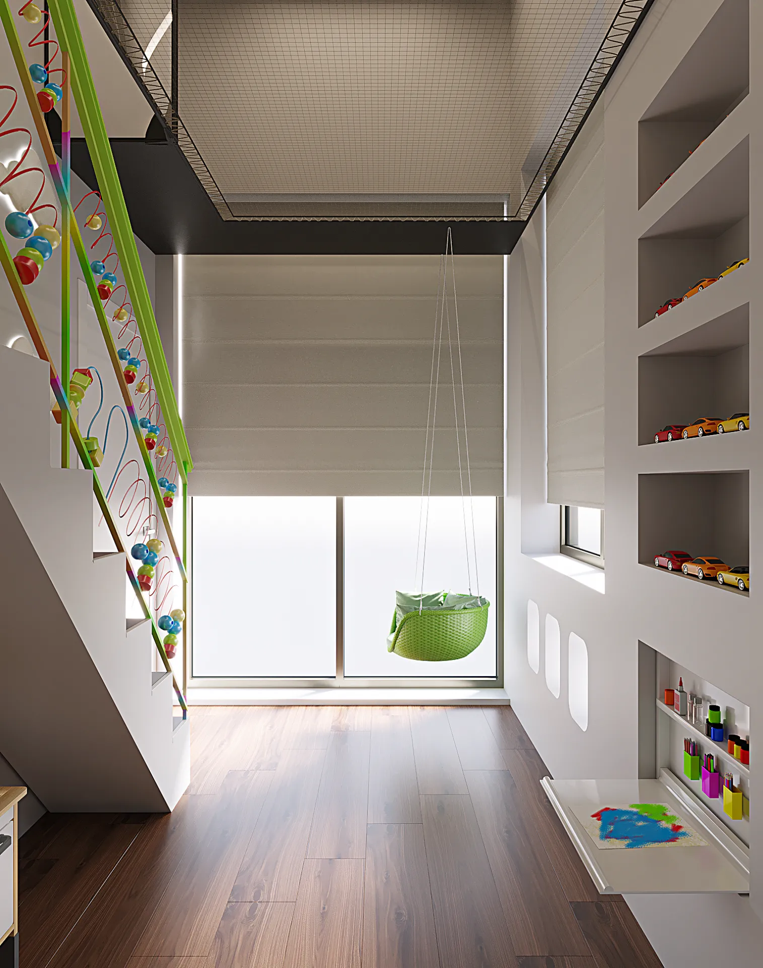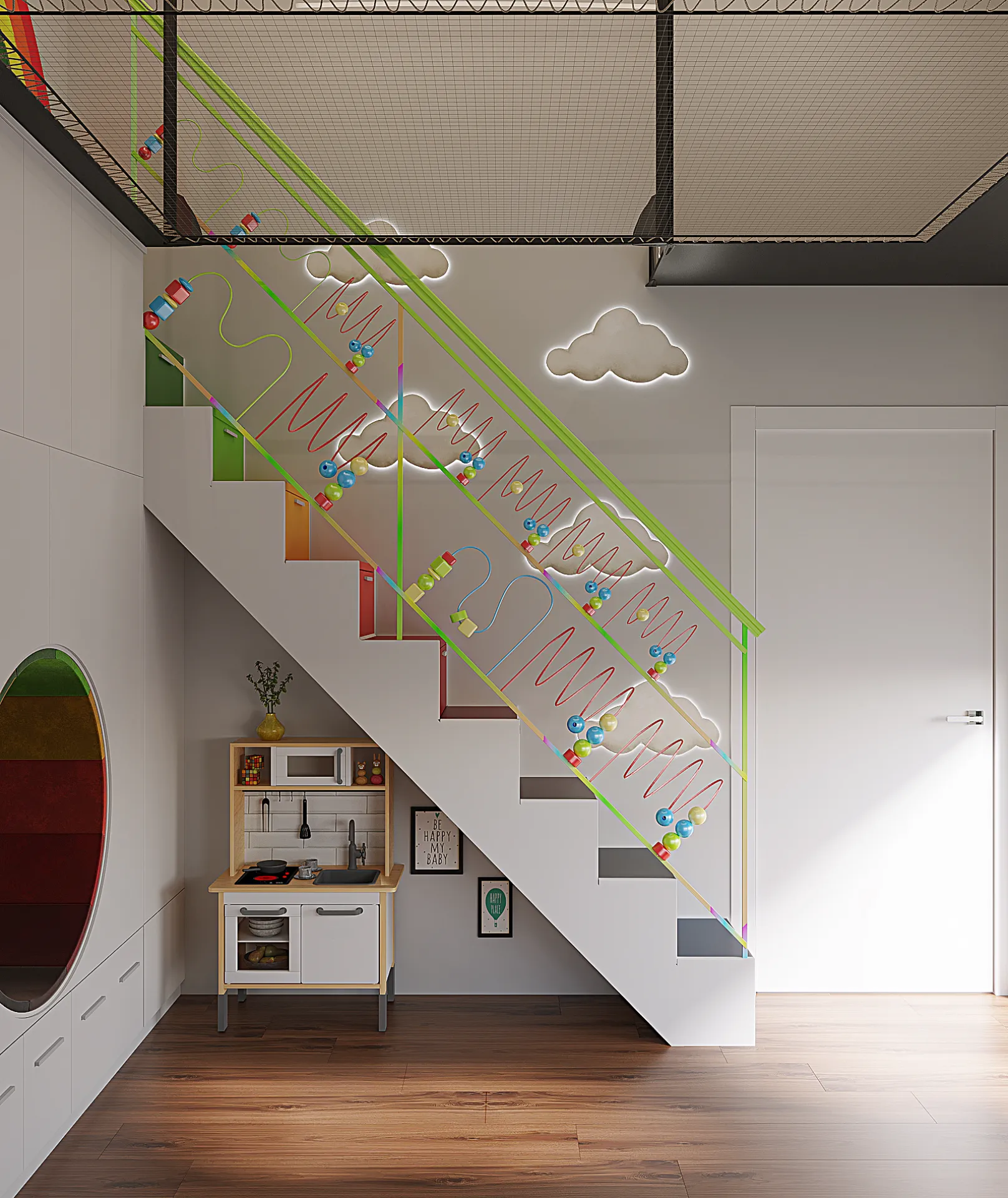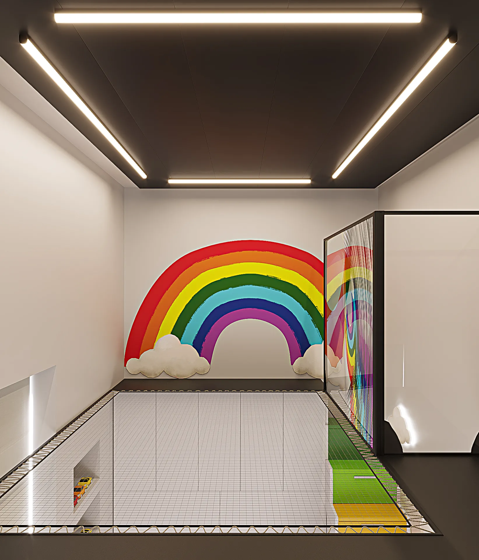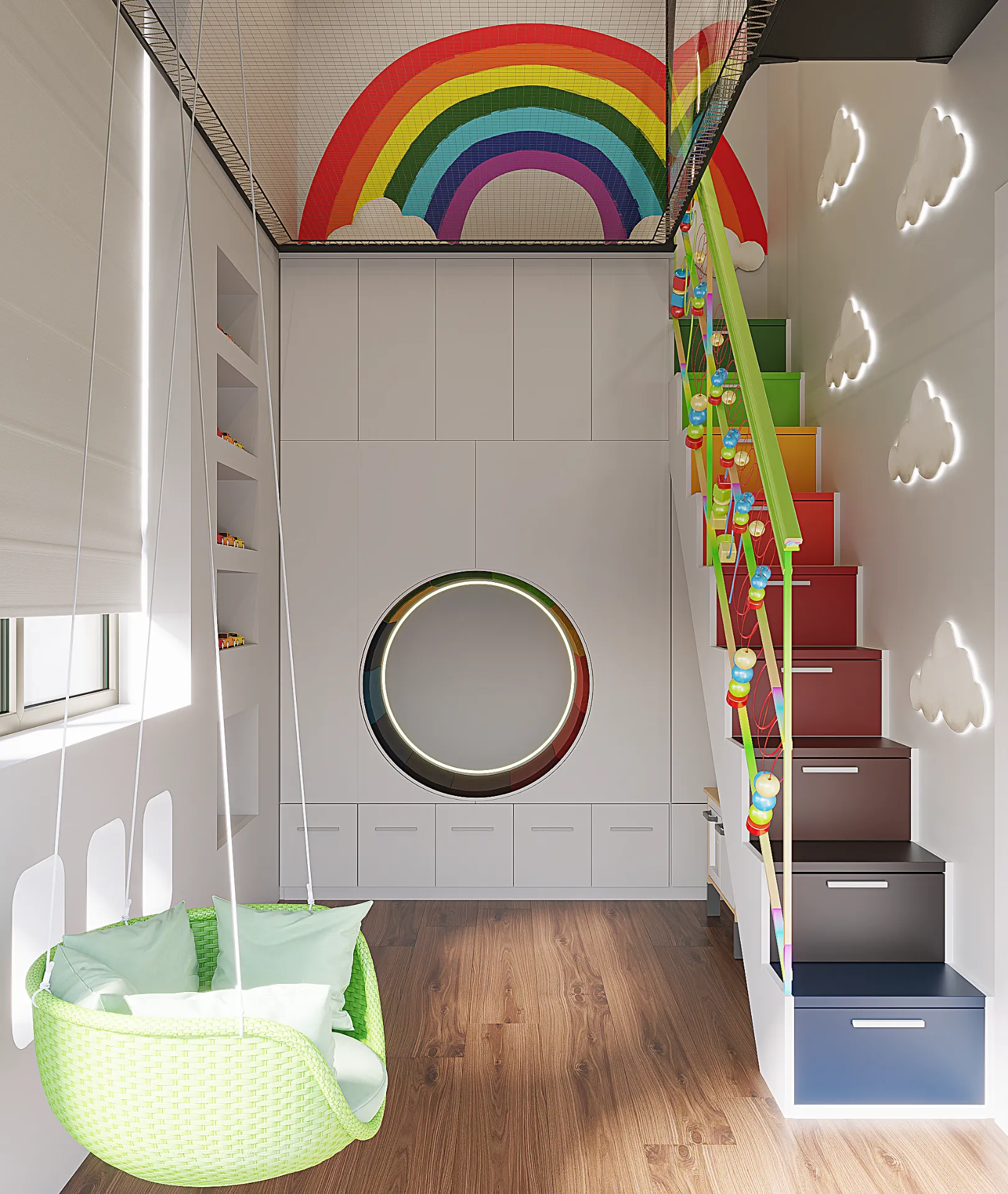 מרפסת סגורה בגודל 10 מ"ר הוסבה לחדר משחקים חווייתי לילדים. העיצוב הגבוה אפשר יצירת גלריה עליונה עם רשת בטיחות שאושרה על ידי מהנדס, וניצול מירבי של החלל. ההשראה – קשת צבעים שמכניסה שמחה, תעוזה ודמיון לעיצוב הפנים.